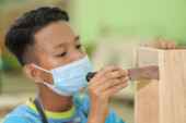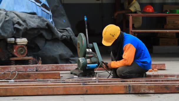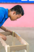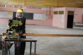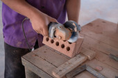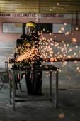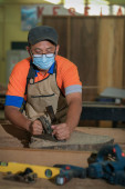 Młody człowiek za pomocą frezu do blach, narzędzi dla przemysłu i budownictwa.