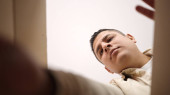 Koronawirus. Chory człowiek z wirusem korony patrzący przez okno, noszący chirurgiczną ochronę maski i wyleczający się z choroby. Pacjent objęty kwarantanną.