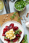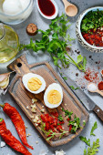 Gotowane jajka kurczaka. Proces gotowania gotowanych marynowanych jaj kurzych z warzywami, ziołami, przyprawami i sosem pomidorowym.