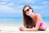 Szczęśliwa kobieta uśmiechając się. odpoczynek na plaży