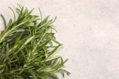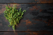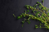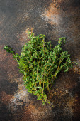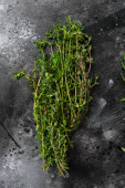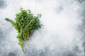 Tymianek zielony organiczna kupa ziół, na szarym tle, widok z góry z miejsca na tekst