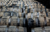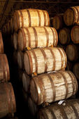 Shizuoka, Japonia-Ocotber 6, 2018: Starannie ułożone beczki lub beczki whisky w olbrzymiej piwnicy