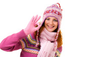 portret piękne blond kobieta w ciepłe ubrania na niebieskim tle