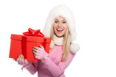 kaukaski blond kobieta w kapeluszu furry i prezenty na białym tle