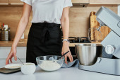 Zdjęcie "Walentynki. Kobieta w czerwonej sukience i szarym fartuchu robi walentynkowe ciasteczka w kuchni" może być wykorzystywane do celów osobistych i komercyjnych zgodnie z warunkami zakupionej licencji Royalty-free. Obraz jest dostępny do pobrania w jakości wysokiej rozdzielczości do 5760x3840.