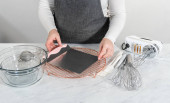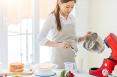 Walentynki. Kobieta w czerwonej sukience i szarym fartuchu robi walentynkowe ciasteczka w kuchni