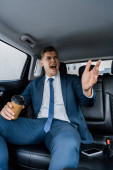 Uśmiechnięty biznesmen za pomocą smartfona i trzymając jednorazowy kubek w samochodzie