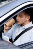 Widok biznesmena trzymającego smartfona z pustym ekranem i kawą na wynos w samochodzie