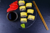 Sushi toczy Filadelfię na czarnym koncie. Widok z góry