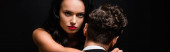 brunetka kobieta w sukience trzymając szklankę szampana i odpychając mężczyzna w garniturze odizolowany na czarny, baner