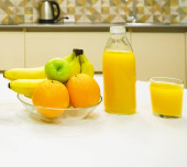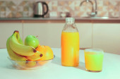 sok pomarańczowy w butelce i szkle. owoce na białym drewnianym stole. Koncepcja zdrowego stylu życia. jedzenie i picie