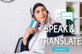uśmiechnięty arabski tłumacz w słuchawkach z cyfrowym tłumaczem na rozmytym pierwszym planie, powitanie słowa w różnych językach ilustracja