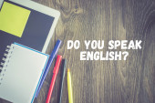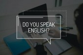częściowy widok tłumacza naciśnięcie klawisza z literami tłumaczenia, bańka mowy z czy mówisz angielski pytanie ilustracja