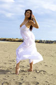 Wspaniała kobieta uśmiechając się i gra patrząc w lecie