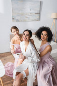 pełna długość szczęśliwy młody córka stojąc obok matka siedzi na stołek na szary