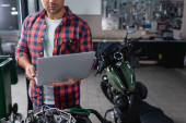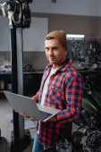 młody mechanik w koszuli w kratkę i czapce patrząc na kamerę w pobliżu zdemontowanej skrzyni biegów motocyklowych