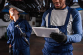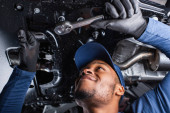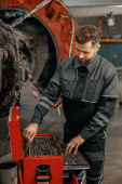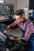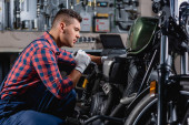 młody mechanik w koszuli w kratę i kombinezonach badający motocykl w garażu