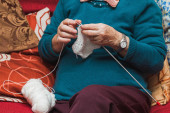 Ręce starszej pani głaszczącej jajko przepiórcze rękojeścią noża, by usunąć skorupę i przygotować posiłek.