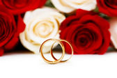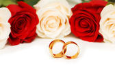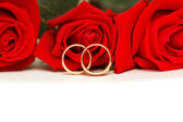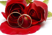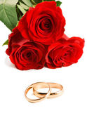 Dwie obrączki i czerwonych róż na białym tle