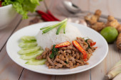 Zdjęcie "Shredded wieprzowe z ryż jaśminowy i zielony sałatka z papai" może być wykorzystywane do celów osobistych i komercyjnych zgodnie z warunkami zakupionej licencji Royalty-free. Obraz jest dostępny do pobrania w jakości wysokiej rozdzielczości do 5760x3840.