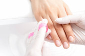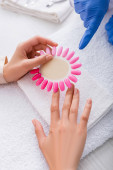 częściowy widok manikiurzysty dotykający palca klienta, baner