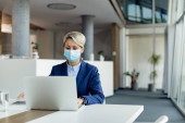 lider zespołu w średnim wieku w okularach i masce medycznej przy użyciu laptopa w biurze