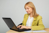piękna młoda kobieta w okularach przy stole z laptopem w biurze