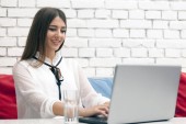 piękna młoda kobieta w okularach z laptopem na kanapie