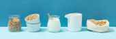 Trzy szklanki słoika z nieprzygotowaną fasolą na szarym tle