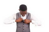 Poważny, przystojny, młody biznesmen w okularach, wybierający numer z czarnego telefonu stacjonarnego. izolowany na białym tle