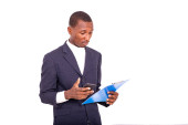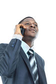 przystojny młody biznesmen w okularach za pomocą czarny telefon komórkowy.