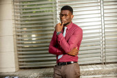młody biznesmen noszący okulary i trzymający czerwony pamiętnik odwracając wzrok