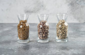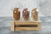 Trzy szklanki słoika z nieprzygotowaną fasolą na szarym tle