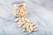 Szklany słoik białej fasoli nerki na drewnianej desce