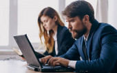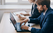 Kolega biznesowy w pracy biurko laptop specjaliści finansowi