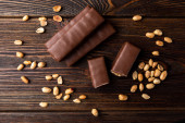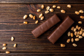 Batonik czekoladowy z karmelem i orzeszkiem ziemnym na ciemnym drewnianym tle.