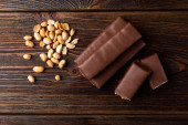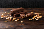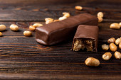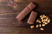 Batonik czekoladowy z karmelem i orzeszkiem ziemnym na ciemnym drewnianym tle.