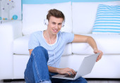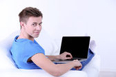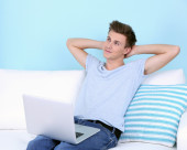 uśmiechający się przystojny facet leżący na kanapie przy użyciu komputera przenośnego