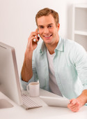 zaskoczony dorywczo przystojny mężczyzna rozmowy na telefon komórkowy