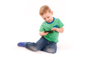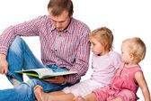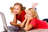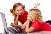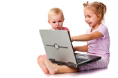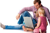 Ojciec z dziećmi, gra na laptopie