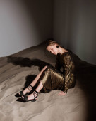 brunetka dziewczyna leżąca na różowy aksamitny puf. Ubrany w czarny kombinezon cekinowy i pozujący w modne pozy. piękna modelka pozowanie. Plakat reklamowy