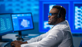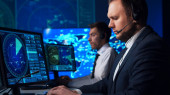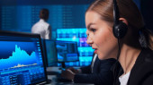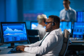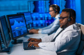 Zespół maklerów pracuje w biurze przy użyciu stacji roboczych i technologii analitycznych. Miejsce pracy profesjonalnych handlowców. Globalne rynki finansowe, biznes, wymiana walut i koncepcje bankowe.