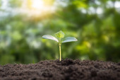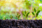 Zdjęcie "Rolnictwo i uprawy roślin sekwencji z porannym słońcem i ciemnozielonym tle rozmycia. Kiełkujące sadzonki wyrastają z nasion. Ekologia przyrody i koncepcja wzrostu z przestrzenią do kopiowania." może być wykorzystywane do celów osobistych i komercyjnych zgodnie z warunkami zakupionej licencji Royalty-free. Obraz jest dostępny do pobrania w jakości wysokiej rozdzielczości do 5760x3840.