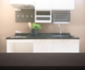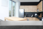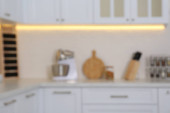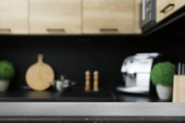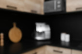 Zamazany widok na wnętrze kuchni z nowoczesnymi meblami