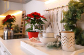 Zdjęcie "Piękna kuchnia ozdobiona doniczkowymi pierwiastkami. Projekt wnętrza" może być wykorzystywane do celów osobistych i komercyjnych zgodnie z warunkami zakupionej licencji Royalty-free. Obraz jest dostępny do pobrania w jakości wysokiej rozdzielczości do 5760x3840.