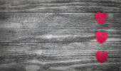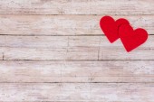 Czerwone serce zabawki w prawym górnym rogu na drewnianym tle. Minimalizm. Przestrzeń kopiowania