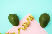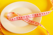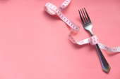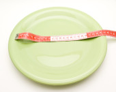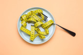 zielony okrągły talerz i czerwona taśma pomiarowa na beżowym tle, koncepcja odchudzania, płaski układ
