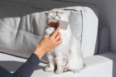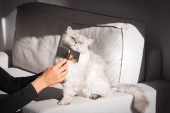 Piękny kot o długich włosach, cieszący się szczotką. Mężczyzna czesający swoje śliczne zwierzątko. Szczotka do grzebienia dla zwierząt domowych