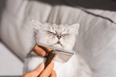 Zdjęcie "Piękny kot o długich włosach, cieszący się szczotką. Mężczyzna czesający swoje śliczne zwierzątko. Szczotka do grzebienia dla zwierząt domowych" może być wykorzystywane do celów osobistych i komercyjnych zgodnie z warunkami zakupionej licencji Royalty-free. Obraz jest dostępny do pobrania w jakości wysokiej rozdzielczości do 5760x3840.
