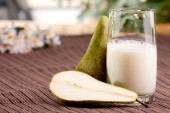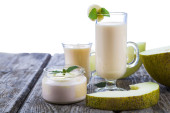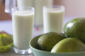 Mleko Koktajl awokado, awokado na stole z dwoma szklankami soku